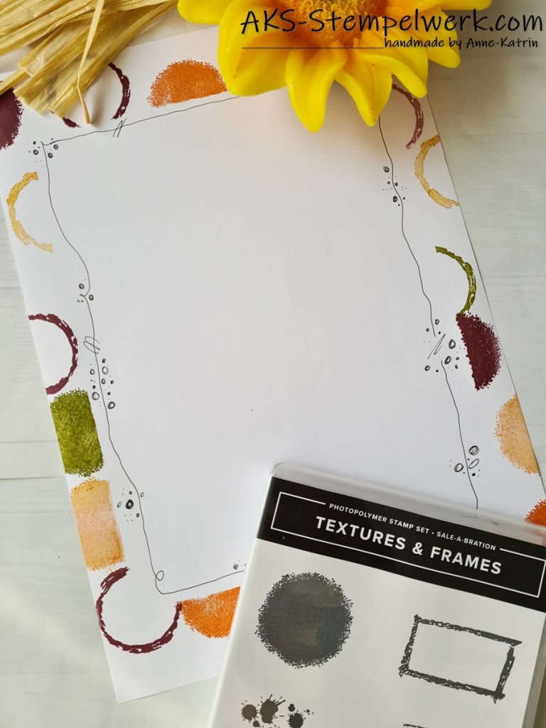 Ich habe einen Bogen DIN A4-Papier genommen und mit zwei Stempelmotiven aus dem SAB-Set „Textures & Frames“ einen Rahmen erstellt.