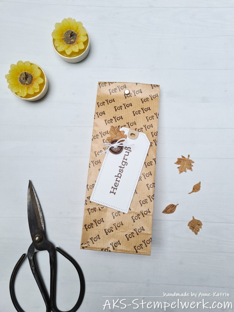Dazu habe ich noch eine kleine Kraftpapier-Tüte bestempelt und mit einem Anhänger aus den Stanzformen „Anhänger nach Maß“ (Hauptkatalog S. 166) dekoriert. Der Spruch und die Blätterdeko stammen aus dem Produktpaket „Freude am Schenken“ (Herbst-Wintermini, S. 61).