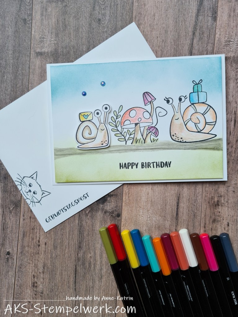 Auf ganz speziellen Wunsch wurde mal wieder das Stempelset „Schneckenpost“ + Stanzen hervorgeholt und diese Geburtstagskarte gewerkelt.