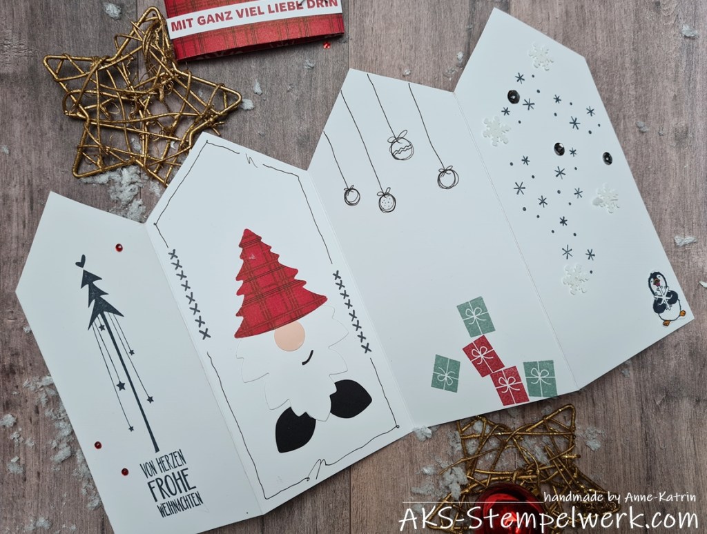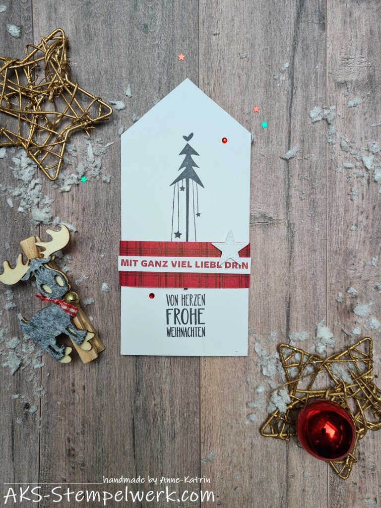 Für die Banderole habe ich das Designerpapier „Weihnachtliche Prints“ aus der letzten SAB verwendet, der Spruch stammt aus dem Stempelset „Festliche Strümpfe“ und der kleine Stern aus den Stanzformen „Bestickte Sterne“.