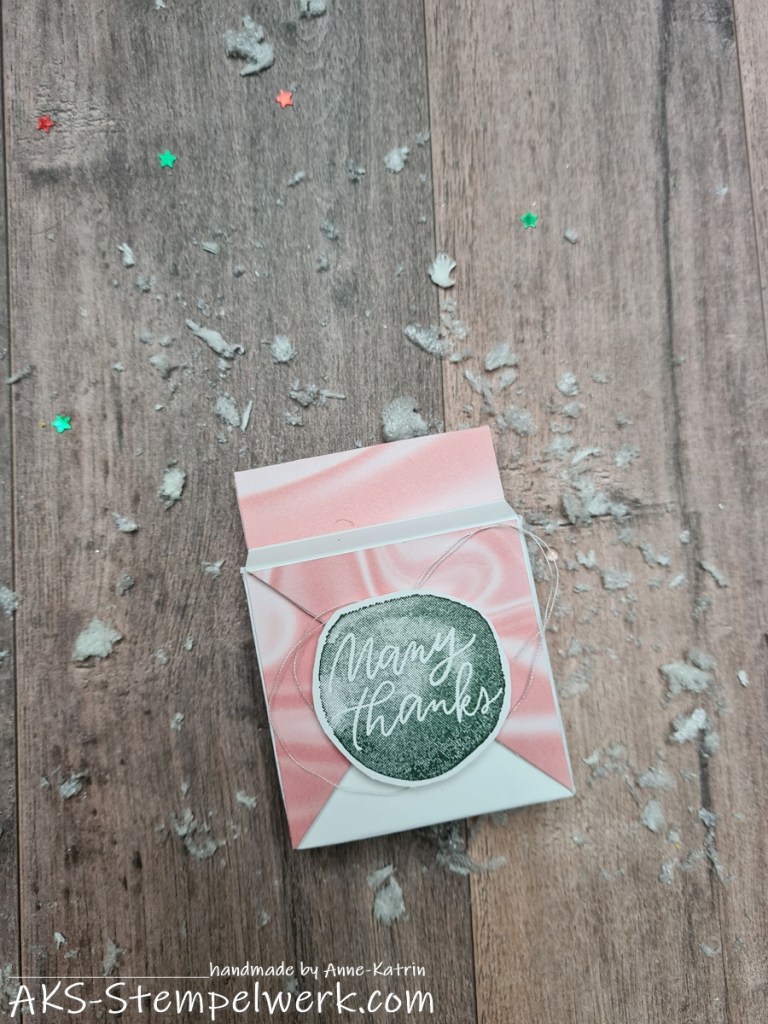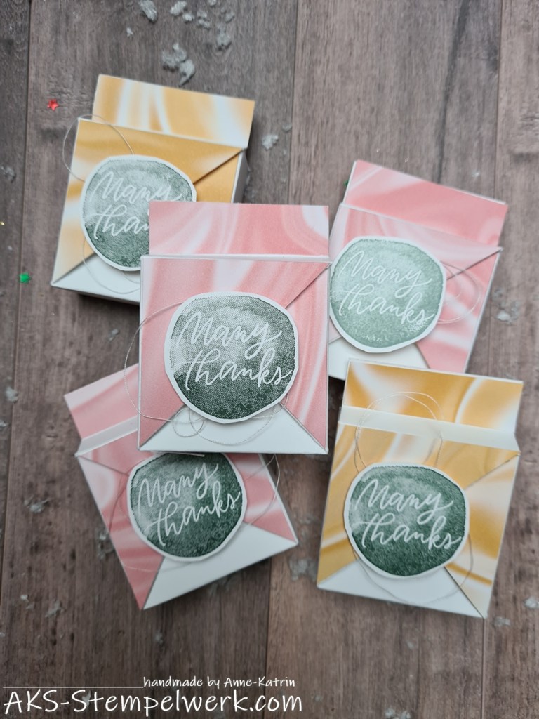 Gestempelt habe ich in lodengrün. In diese Verpackung passt ganz prima eine kleine flache Süßigkeit hinein…