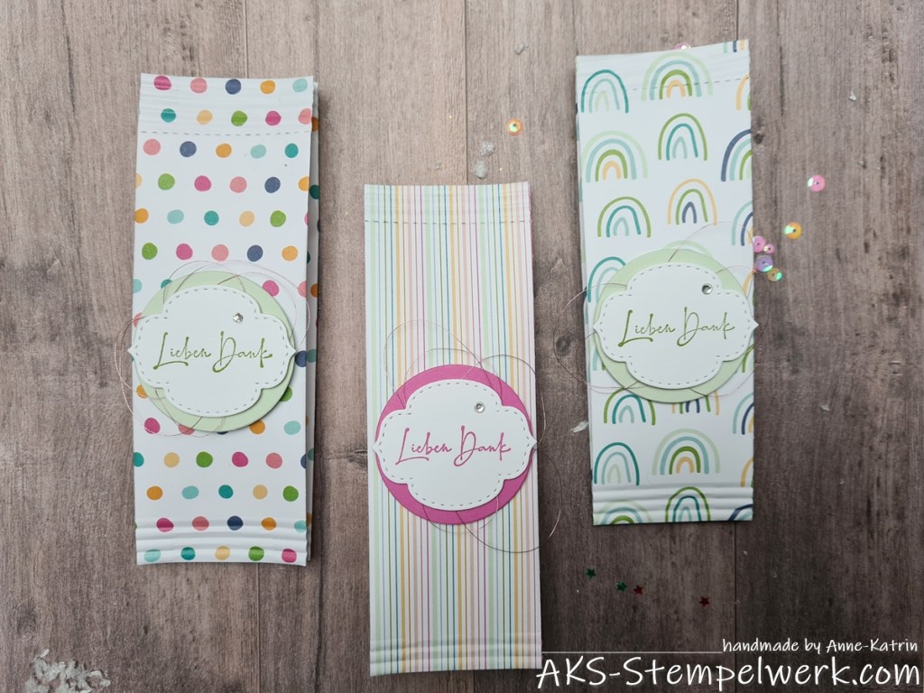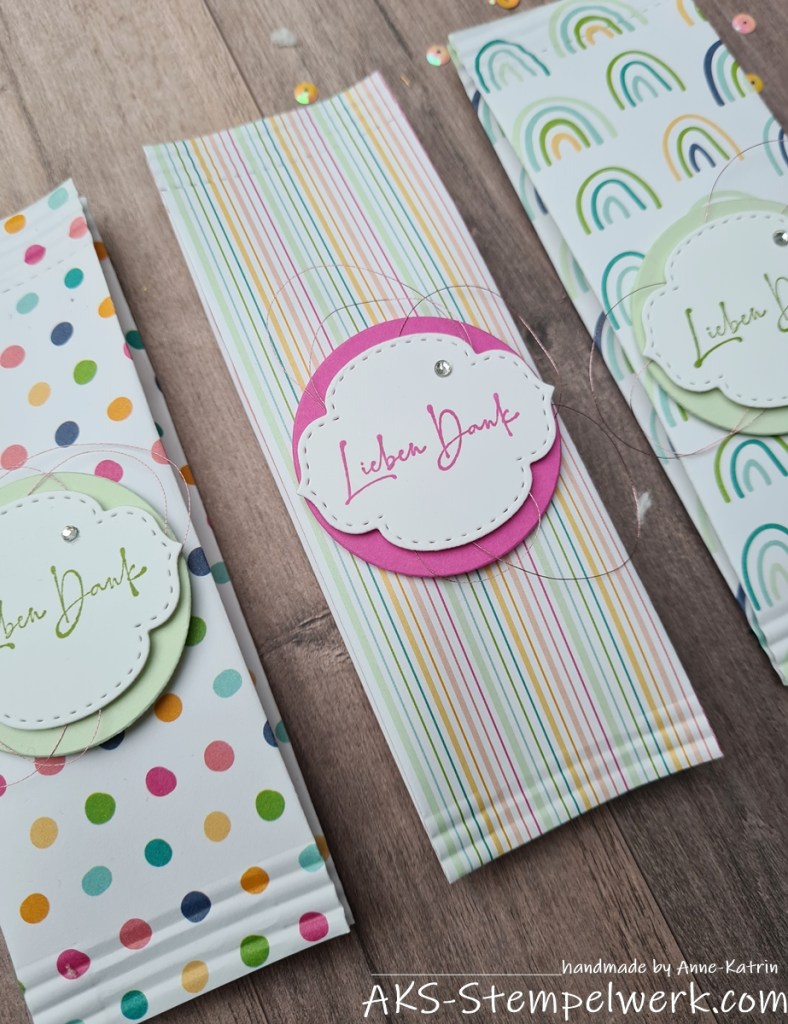Ich habe für unseren heutigen Blog Hop das Designerpapier „Sonnenschein und Regenbogen“ gewählt. Die Bögen sind 6 x 6″ (bzw. 15,2 x 15,2 cm) und es lassen sich super diese kleinen Goodies daraus werkeln.