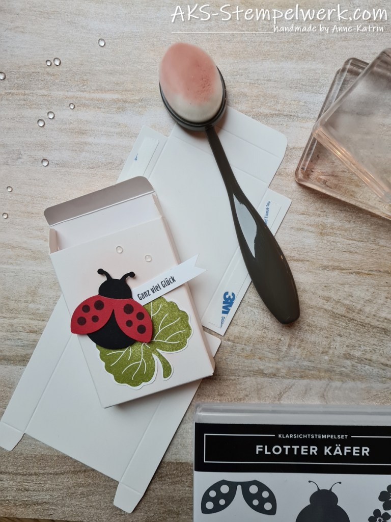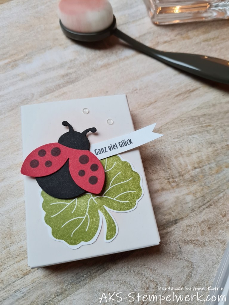 Zum Stempelset gibt es die passende Handstanze für den Käfer, nur das Blatt habe ich per Hand ausgeschnitten. Und auch der Spruch ist im Set enthalten. 🙂