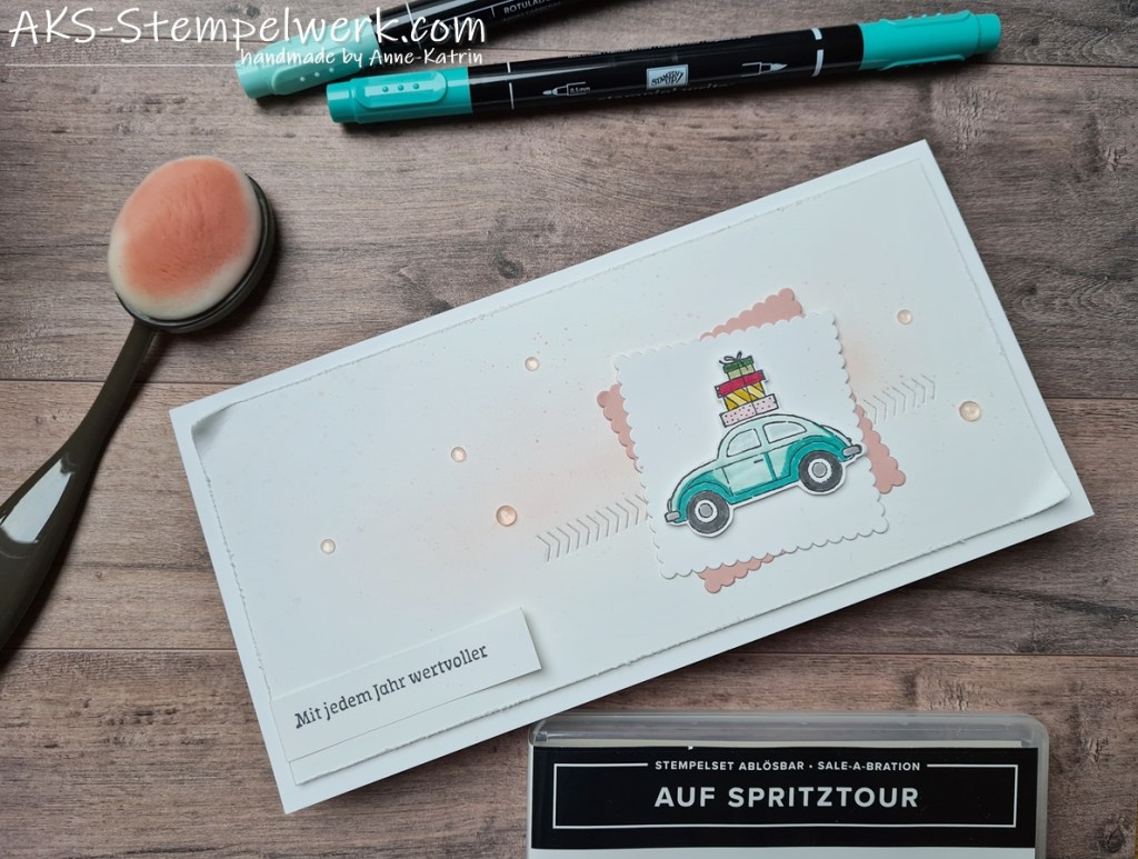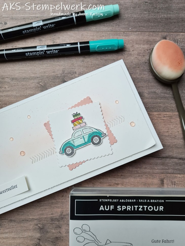 Spruch und Stempelmotiv stammen aus dem besagten SAB-Stempelset „Auf Spritztour“, das Ihr Euch noch bis Ende Februar gratis für eine Bestellung ab 60 € aussuchen könnt.