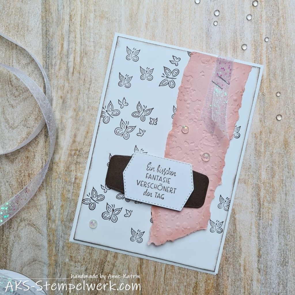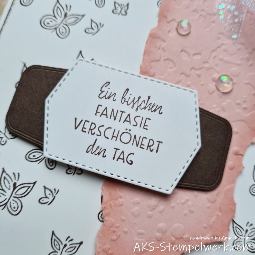 Für den Hintergrund und den Spruch habe ich das SAB-Set „Schmetterlingsfantasie“ gewählt und in espresso gestempelt.