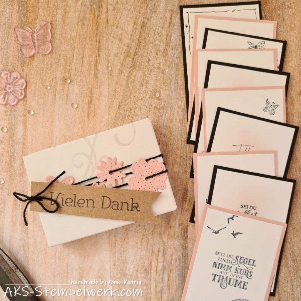 Mit den „süßen Schachteln“ (Frühjahr-Sommermini, S. 9) habe ich diese kleine Danke-Box gewerkelt, gefüllt mit verschiedenen selbstgestalteten Spruchkarten.