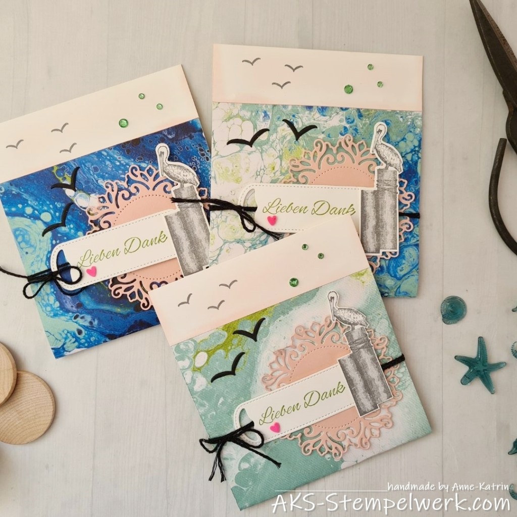 Zuvor habe den Hintergrund noch ein bißchen mit den Blending Pinseln gewischt und mit den tollen Vögeln aus dem Stempelset „Meer an Glück“ bestempelt und natürlich auch die passenden Strasssteine „Meereswellen“ ausprobiert. Die sind meeeeeeega!!!