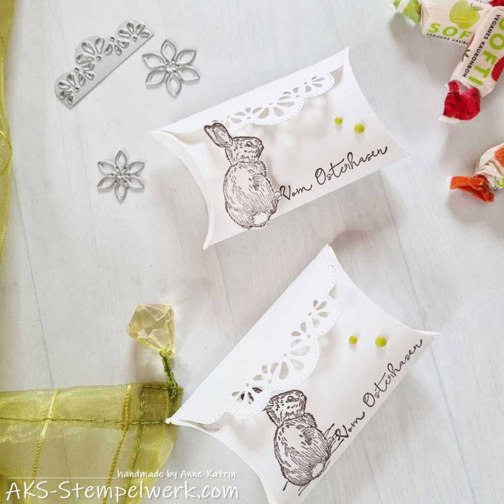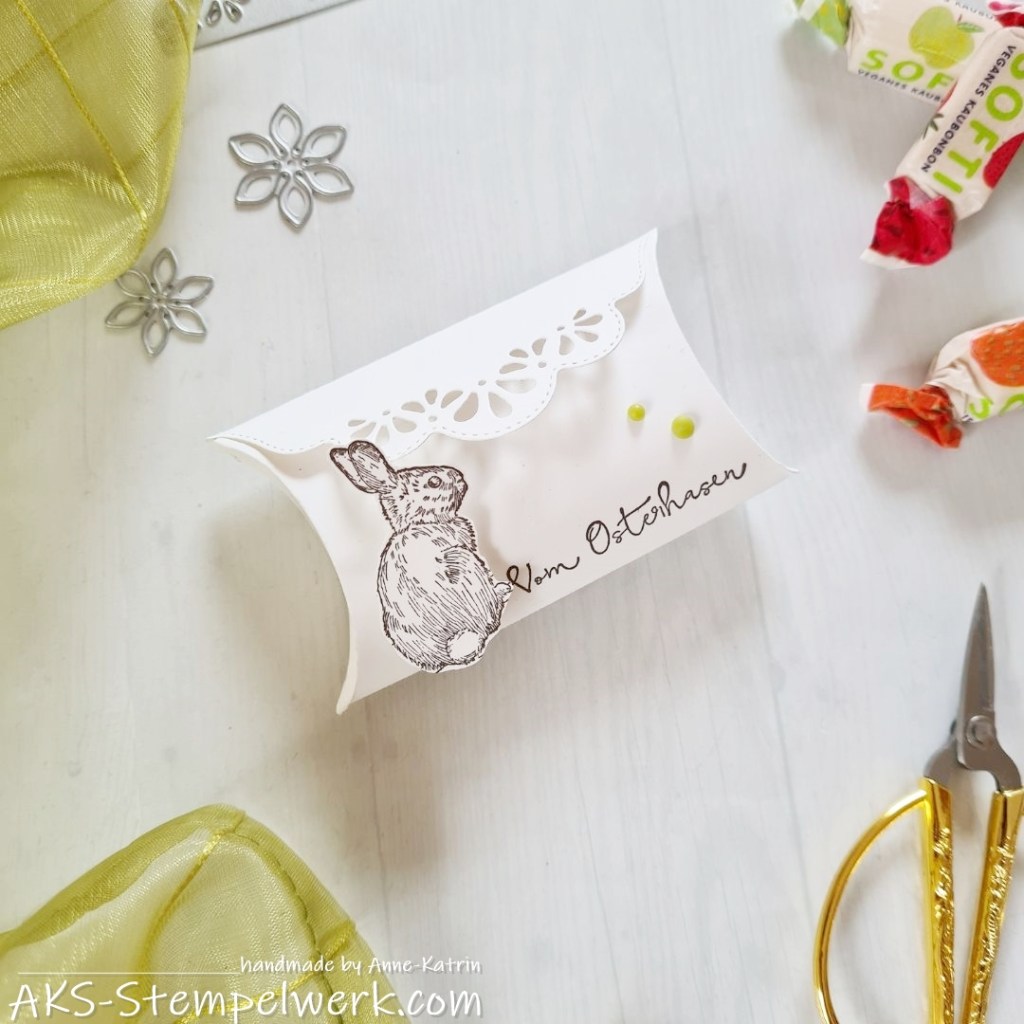 Dafür habe ich die Stanzschablone „Kreative Kissenschachtel“ (Bestell-Nr. 156321), die es immer noch zu bestellen gibt, verwendet. Ich liebe diese Pillowboxen ja total und in diesem clean and simple-Style gefallen sie mir richtig gut.