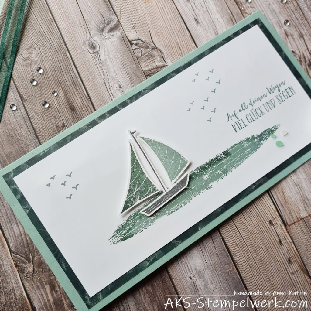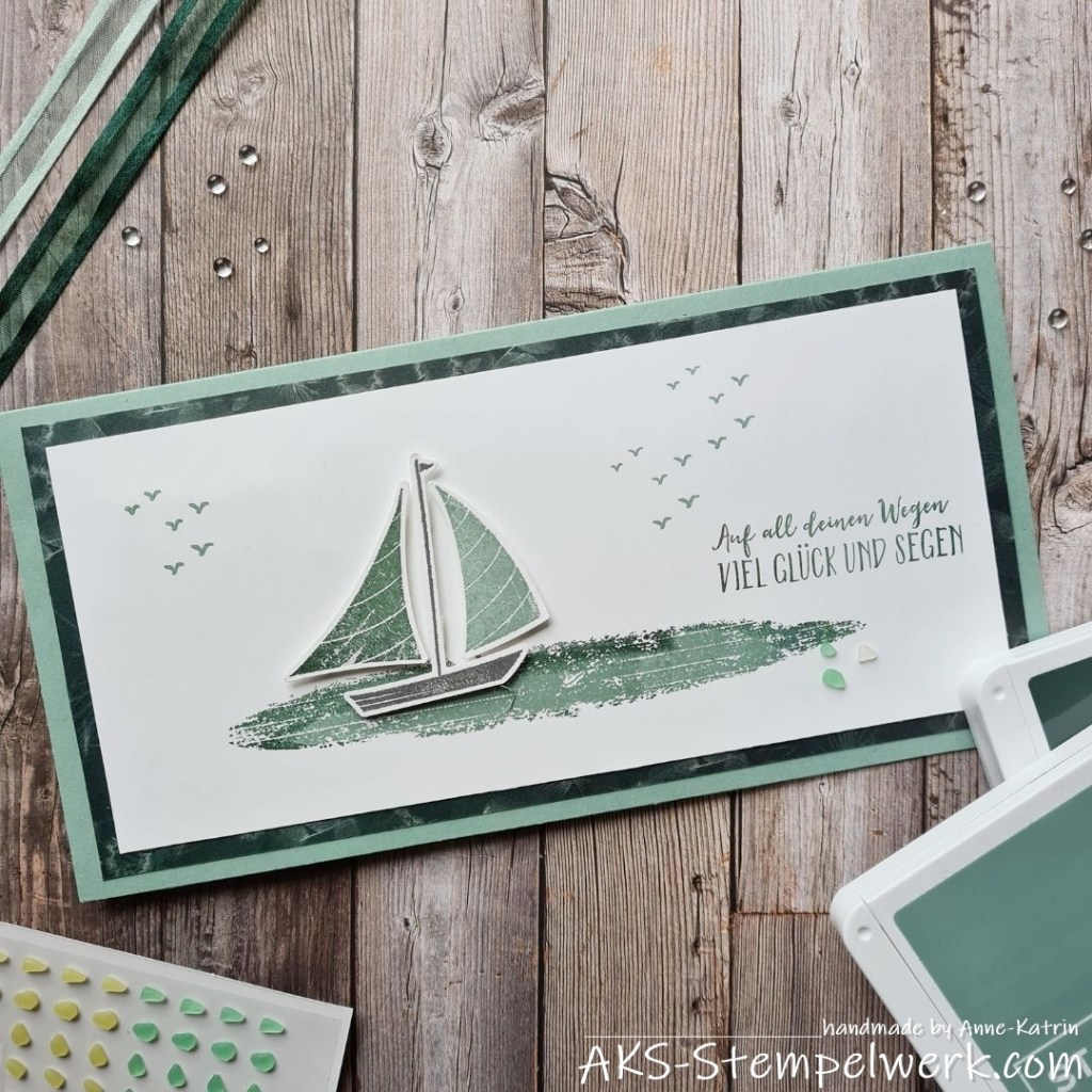 Also habe ich das Produktpaket „Leinen los“ (Frühjahrsommermini, S. 70) gewählt mit der dazu passenden Handstanze.