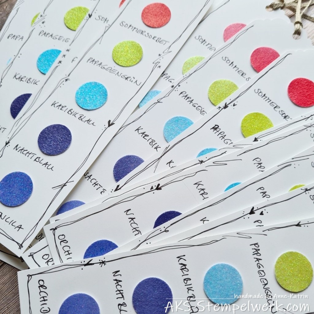 Für meine Goodies habe ich Lesezeichen gewerkelt und das Glitzerpapier in 6 x 6 “ (Jahreskatalog S. 139) gewählt, das leuchtet besonders schön.