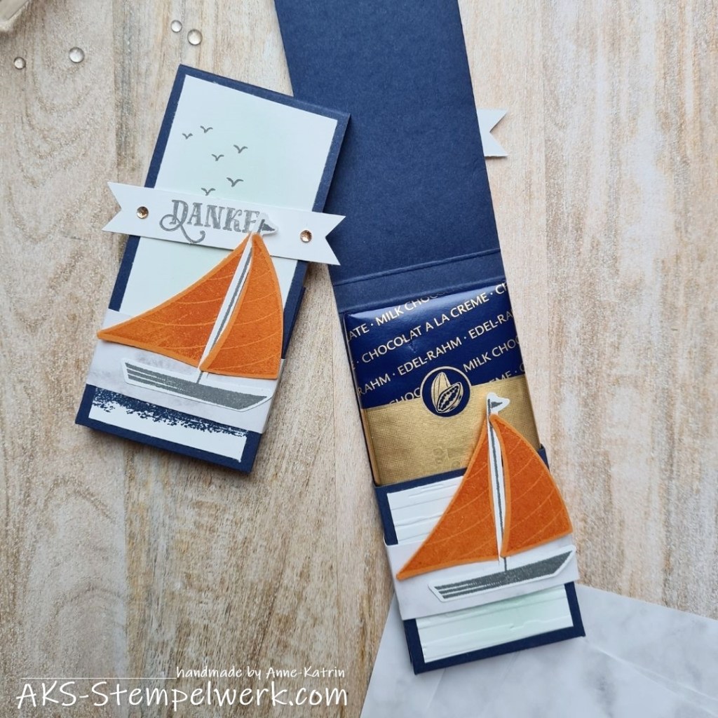 Verschlossen wird die Box mit einer Banderole aus Designerpapier. Darauf ist das Segelboot angebracht.