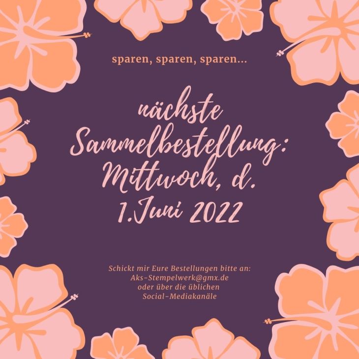 Eine Sammelbestellung werde ich morgen Abend auch aufgeben. Bitte schickt mir auch dafür rechtzeitig Eure Bestellungen und ggf. Ersatzwünsche, falls Artikel bereits vergriffen sein sollten.