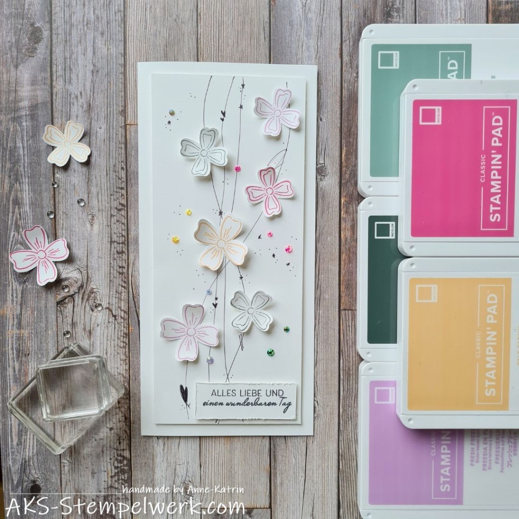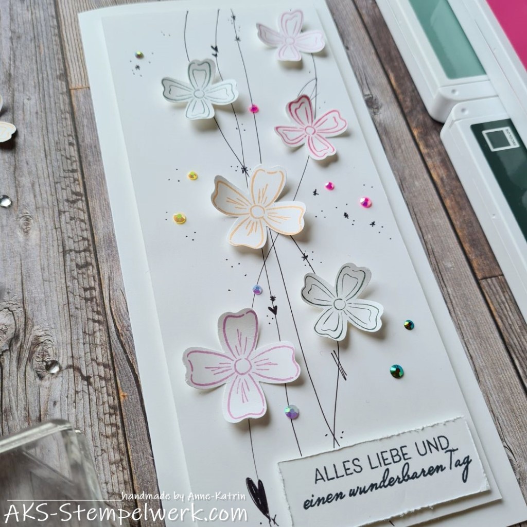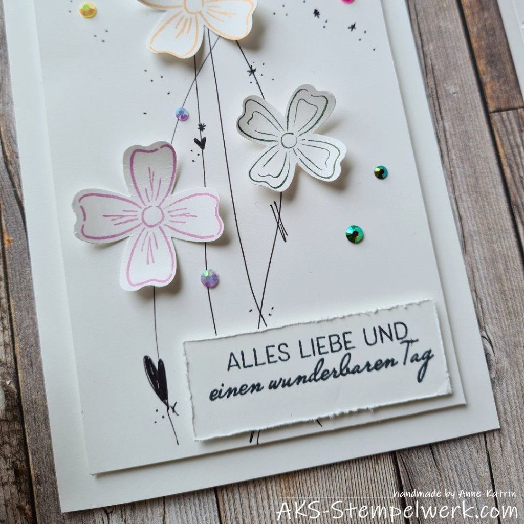 Die Blüten sind teilweise mit Tombow aufgeklebt, manche aber ebenfalls mit den Dimensionals befestigt, sodass ein bißchen Tiefenspiel entsteht.