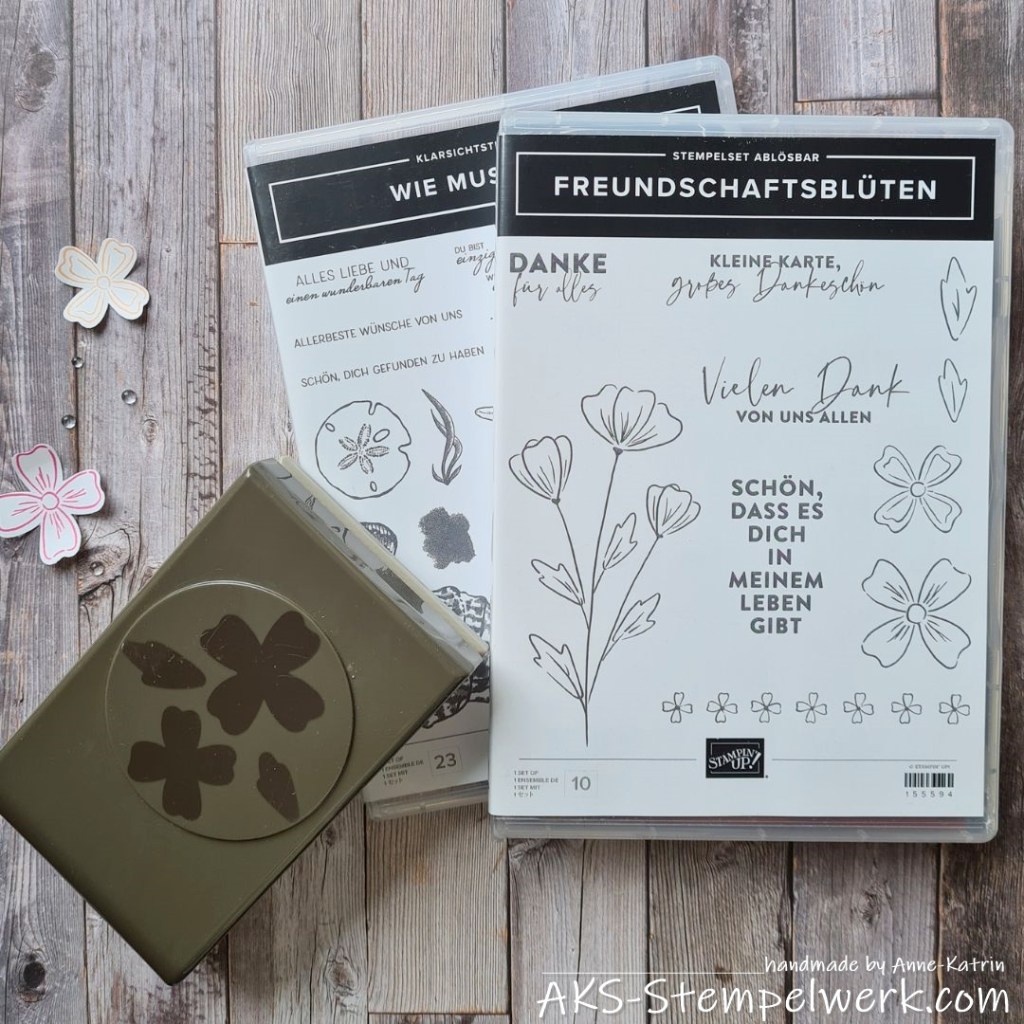 Verwendet habe ich für die Glückwunschkarte das Set „Freundschaftsblüten“ (Hauptkatalog S. 73) mit der passenden Handstanze „Blüten und Blätter“ (Hauptkatalog S. 153).