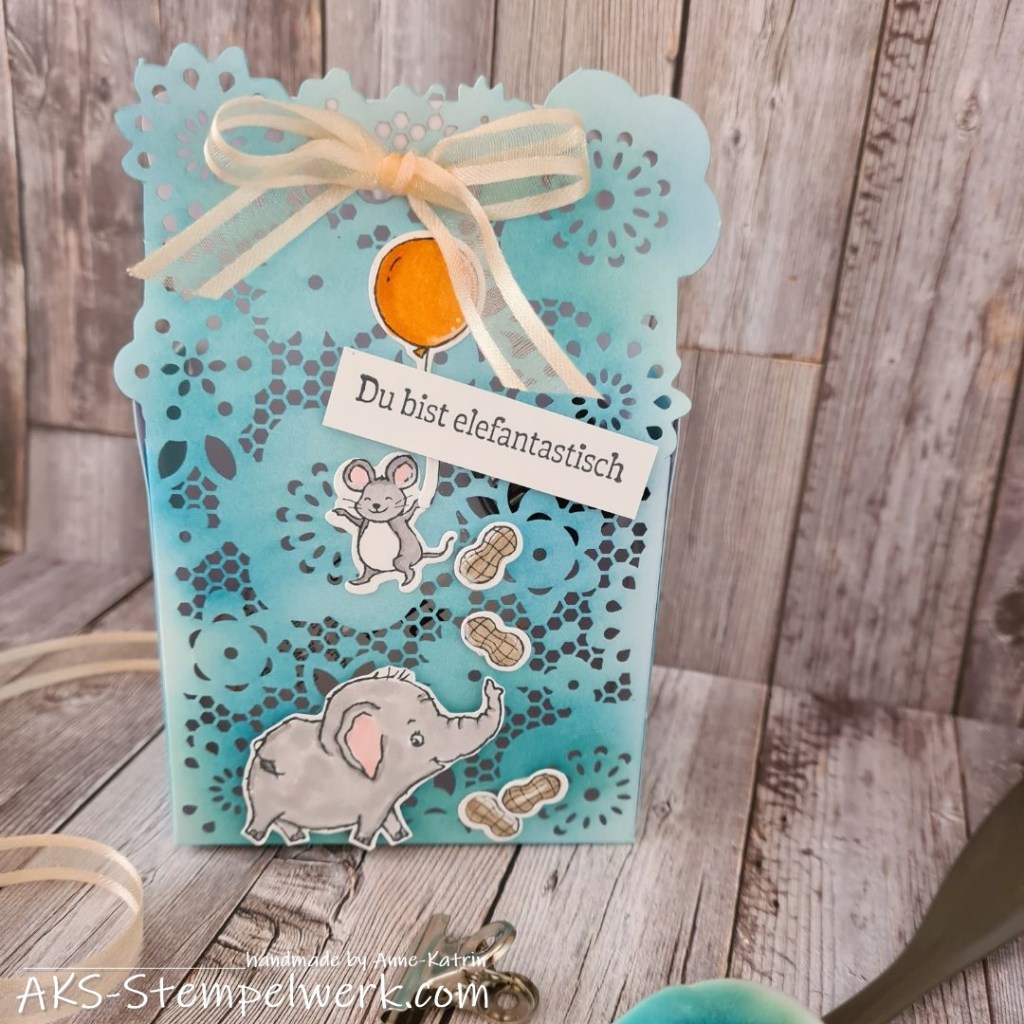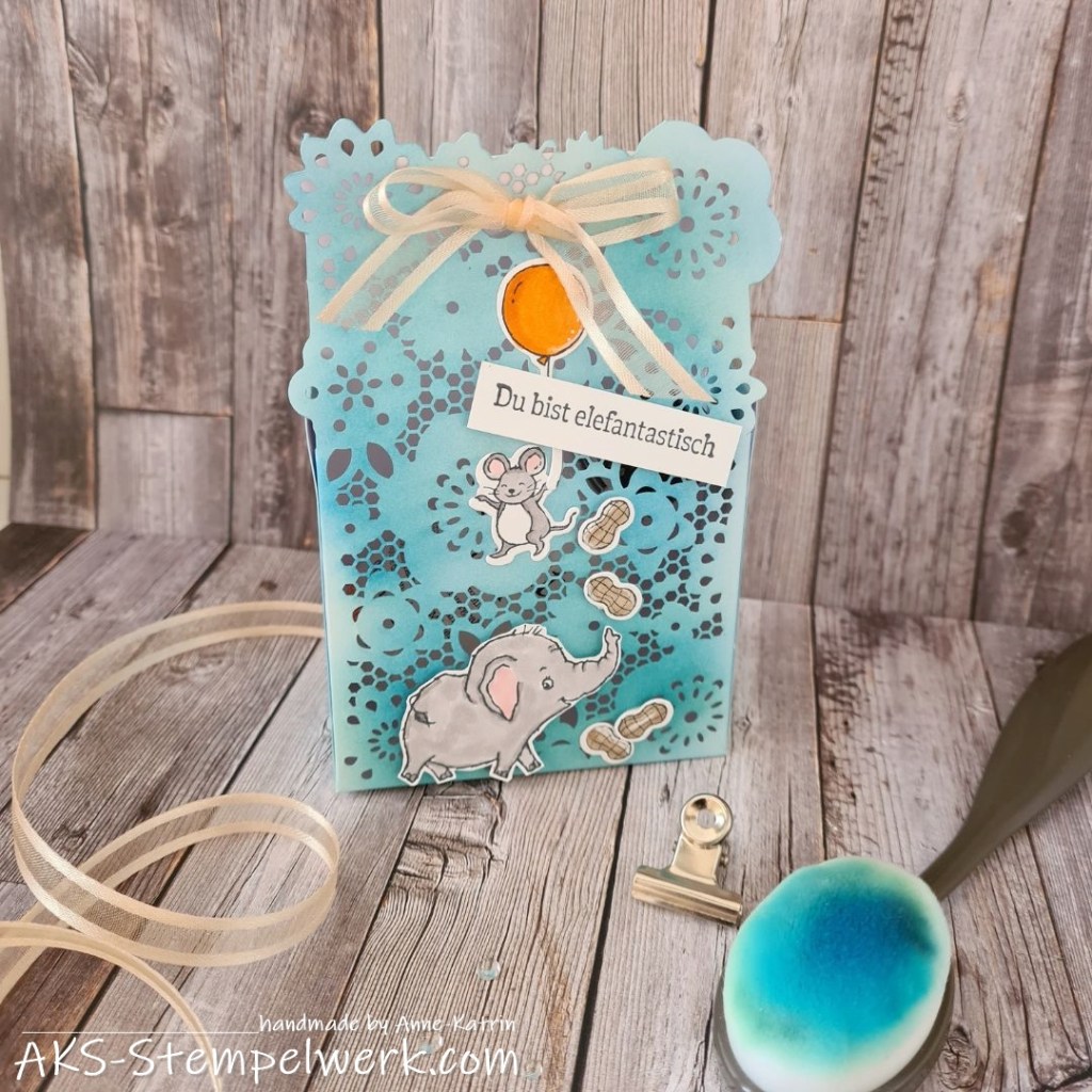 Kreativ war ich aber auch und habe hier mal wieder eine „Geschenkschachtel mit Zierdetails“ (Hauptkatalog S. 140) als Geschenktüte verziert. Diesmal in einem schönen kräftigen blau – grün eingefärbt, klischeehaft also „jungstauglich“ 😉
