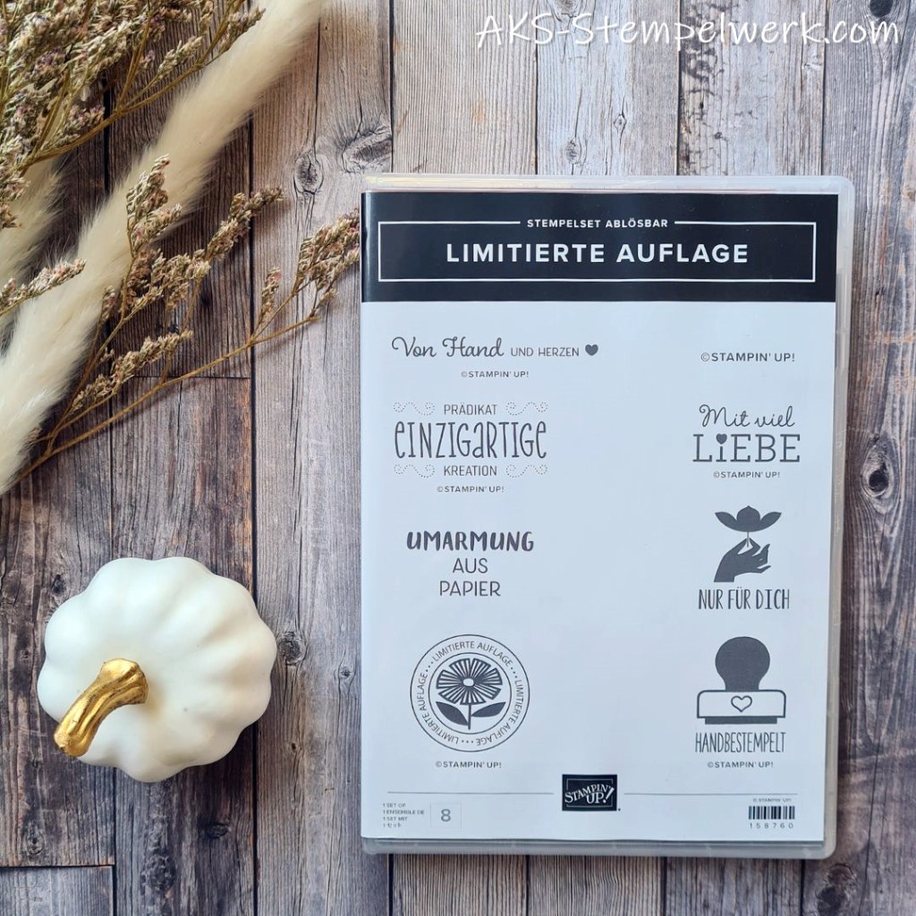 Und ganz besonders ans Herz legen möchte ich Euch das Stempelset „Limitierte Auflage“ aus dem Hauptkatalog S. 119. Das habe ich nämlich für den Spruch oben verwendet und ich liebe es total.
