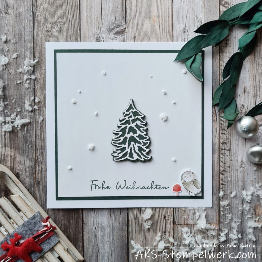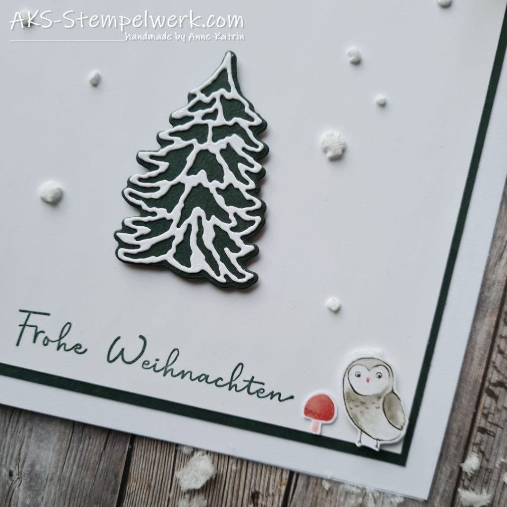 Ergänzt habe ich dann noch den Spruch (ebenfalls aus dem Stempelset „Weihnachtsgrüße“ (Hauptkatalog S. 45) und die Eule mit dem Pilz (ausgeschnitten aus dem Designerpapier „Fröhlicher Wald“ Hauptkatalog S. 132).
