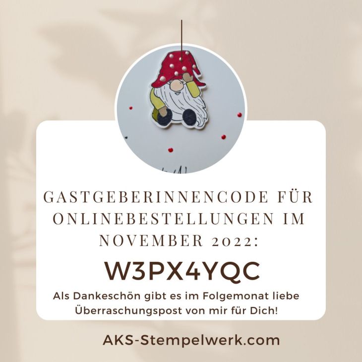 Oder Ihr shoppt direkt online! Wer für seine Onlinebestellung meinen Gastgeberinnencode für November verwendet, darf sich im Dezember auf Überraschungspost von mir freuen. 🙂