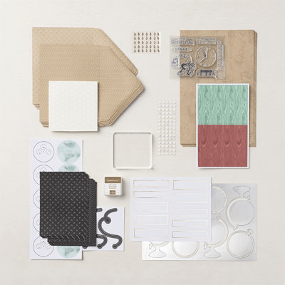 - Enthalten sind: bedruckte Grundkarten, vorgeschnittene, bedruckte Elemente, Klebemittel, Accessoires und ein transparenter Block.