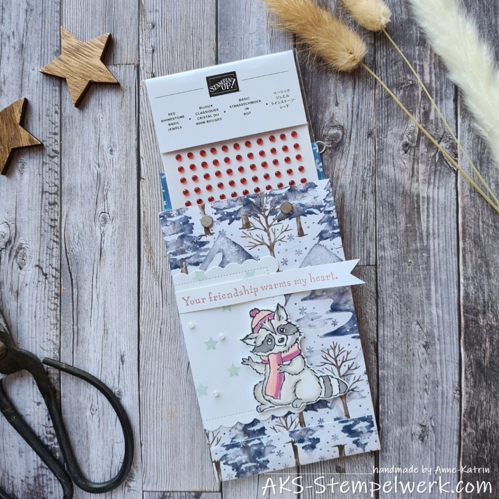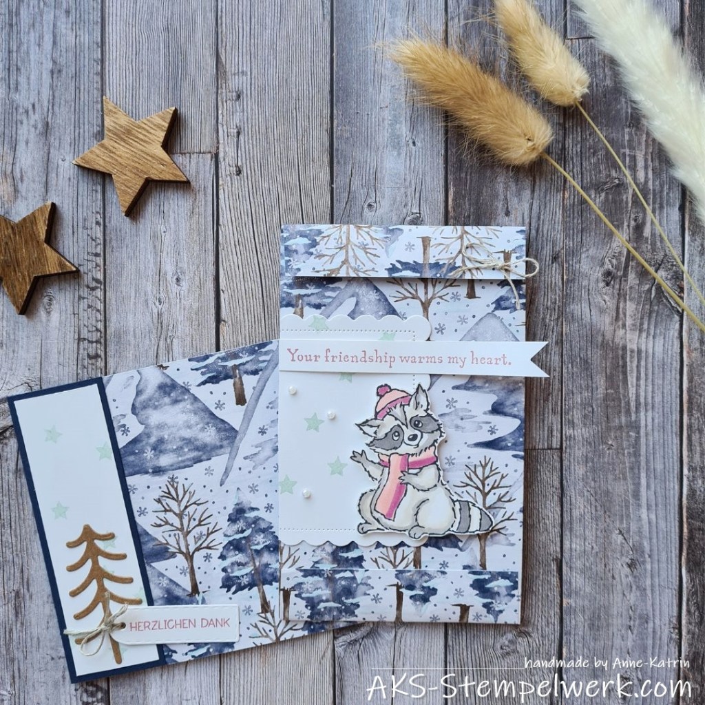 Hier musste unbedingt der süße Waschbär aus dem Set „All bundled up“ (Minikatalog Juli-Dezember 2022, S. 45) mit drauf, den ich in letzter Zeit so gerne verwende.