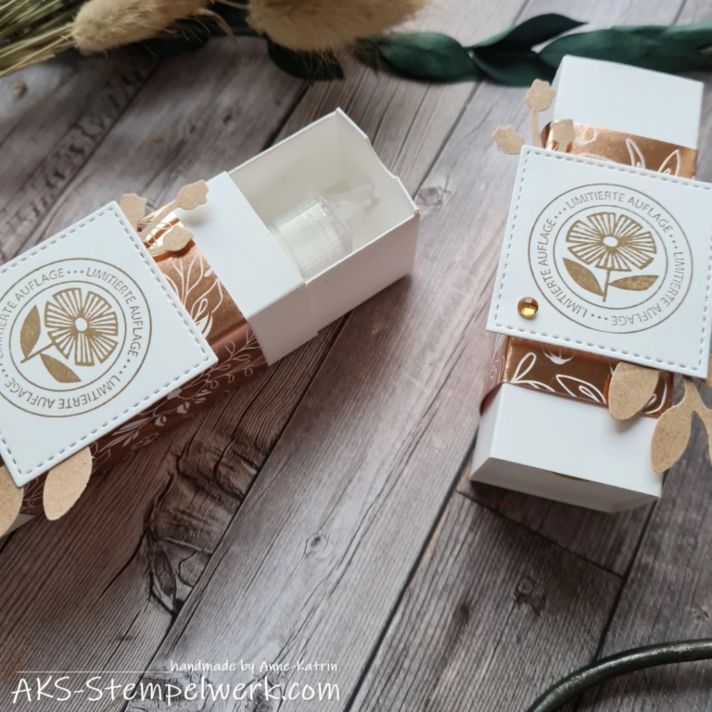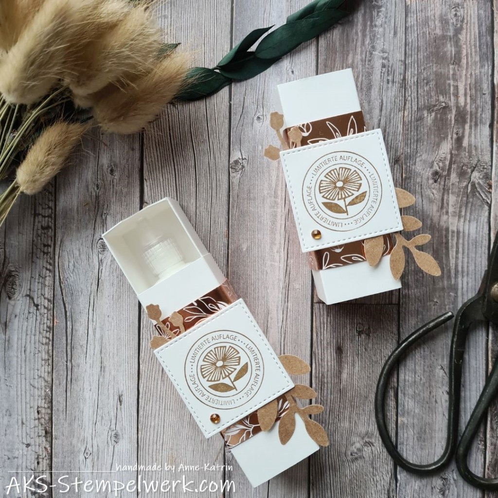 Da habe ich etwas für Euch. Bereits vor einiger Zeit habe ich diese süßen Schächtelchen gewerkelt mit dem besonderen Designerpapier „Schöner Tag“ (aus dem auslaufenden Herbst-Winter-Mini, S. 65). Aber natürlich könnt Ihr auch jedes andere schöne Papier dafür verwenden.