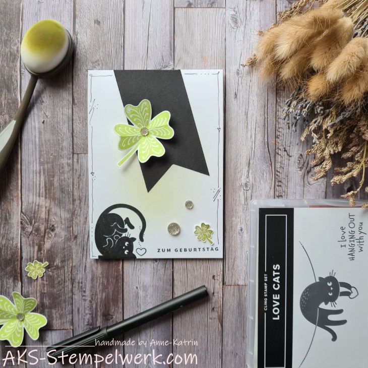 Alternativ zu meiner Neujahrskarte habe ich noch diese Geburtstagskarte mit dem süßen Stempelset „Love Cats“ (Minikatalog Januar – April 2023, S. 13) gemacht.