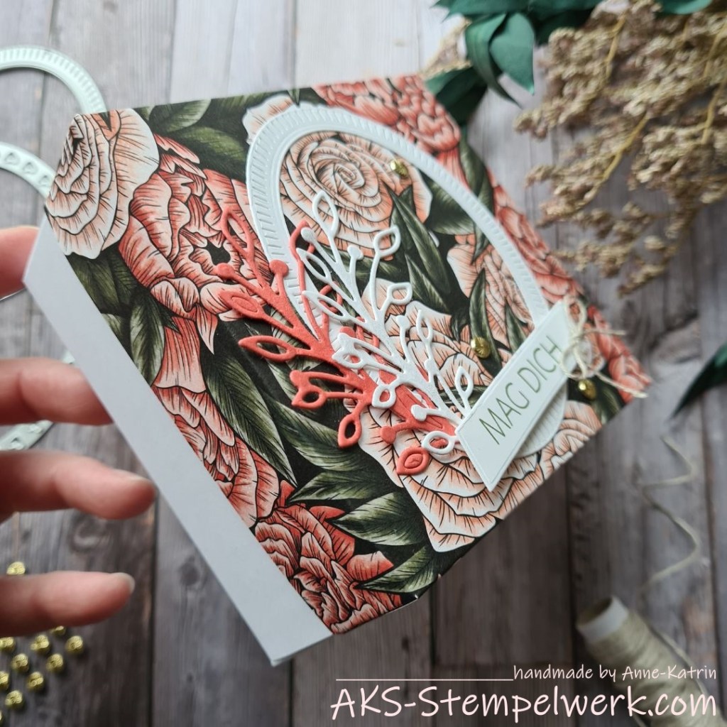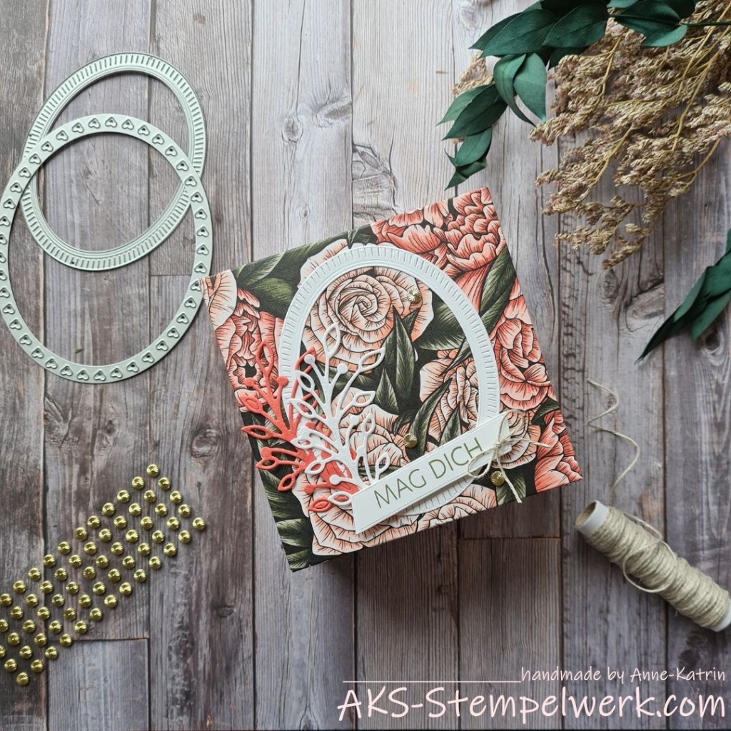 Für die Verzierung habe ich die Stanzformen „Gerahmt mit Blumen“ (Minikatalog Januar-April 2023, S. 65) gewählt. Gibt es einzeln oder als Sparpaket gemeinsam mit den Stempeln.