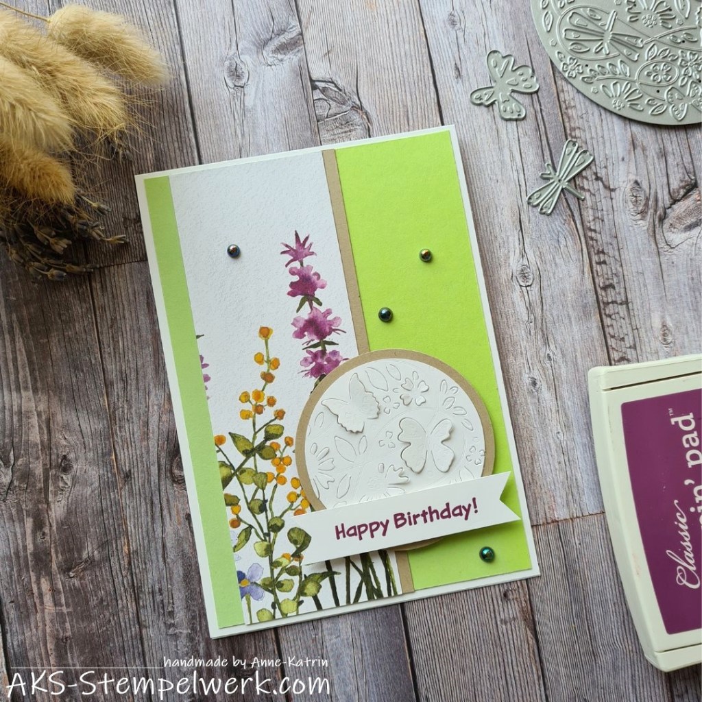 Der Clou dieser Karte ist natürlich der Kreis, für dessen Gestaltung ich die Stanzformen „Imposante Pop-Ups“ (Hauptkatalog S. 172) gewählt habe. Ich muss zugeben, dass ich die lange übersehen habe, aber ich finde sie sooooo, soooo spitze. Natürlich gerade jetzt zur Frühlingszeit. 😊 (ACHTUNG: niedrige Lagerbestände!!!)