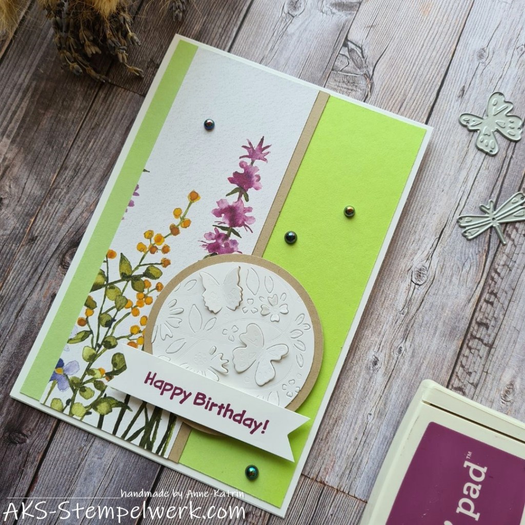 Ein paar Perlchen dürfen natürlich nicht fehlen und schon habt Ihr eine frühlingshafte Geburtstagskarte zur Hand.