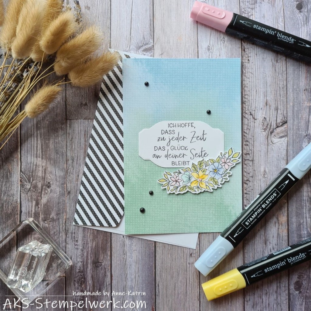 Das schöne Blumembouquet habe ich auch wieder mit den Stampin‘ Blends coloriert und mit den Dimensionals/3d-Abstandklebepads aufgeklebt. Ich finde das hat echt was…