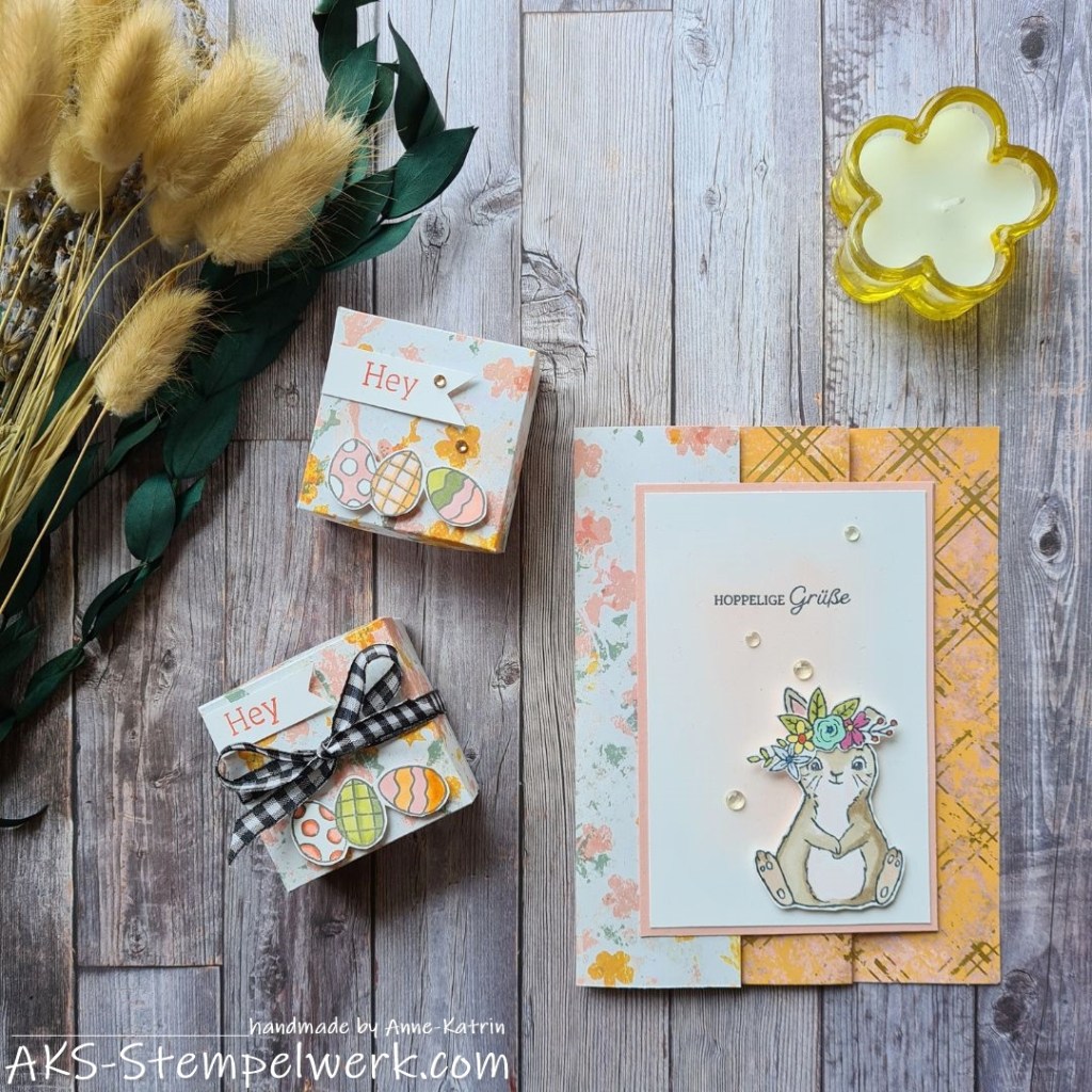 Verwendet habe ich das Designerpapier „Fantasievolle Texturen“ (Hauptkatalog S. 134) und das Stempelset „Osterhase“. (Minikatalog Januar-April 2023, S. 52)