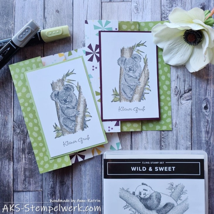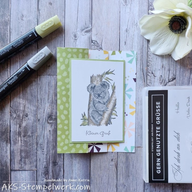 Der niedliche Koala stammt aus dem Stempelset „Wild and sweet“ (Hauptkatalog S. 87) und lässt sich total gut mit den Stampin‘ Blends colorieren.