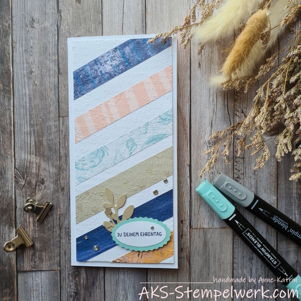 Hier habe ich verschiedene Streifen Designerpapier in regelmäßigen Abständen auf ein Stück weißen Farbkarton geklebt und anschließend mit dem Prägefolder „Vintage Druckschrift“ geprägt.