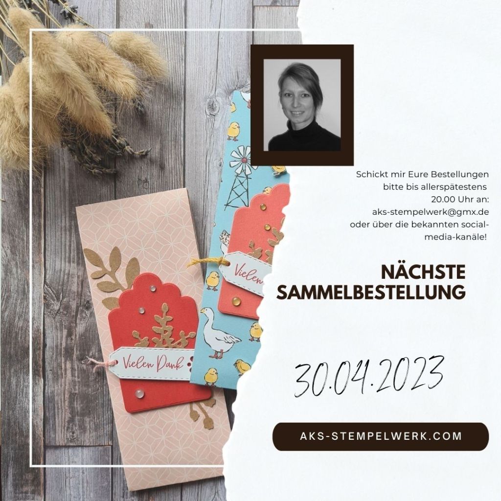 Mitten in den Countdown zum neuen Katalog gebe ich am Sonntag noch mal eine Sammelbestellung auf. Wenn Ihr Euch letztmalig in der Aktion „Letzte Chance auf Auslaufprodukte“ noch etwas von der Ausverkaufsliste sichern wollt, nutzt gerne diese Gelegenheit und schickt mir Eure Wünsche zu!