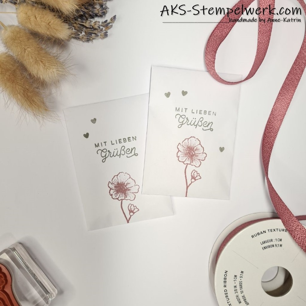 Auf Instagram habe ich neulich schon ein kleines Reel zu diesen süßen, selbstgewerkelten Tütchen gemacht, die ich mit „bunten Blumensamen für Insekten“ gefüllt und den Sets „Runde Sache“ (Jahreskatalog S. 17), „Aus der Natur“ (Jahreskatalog S. 24) und „Mit Liebe gestempelt“ (Jahreskatalog S. 117) bestempelt habe.