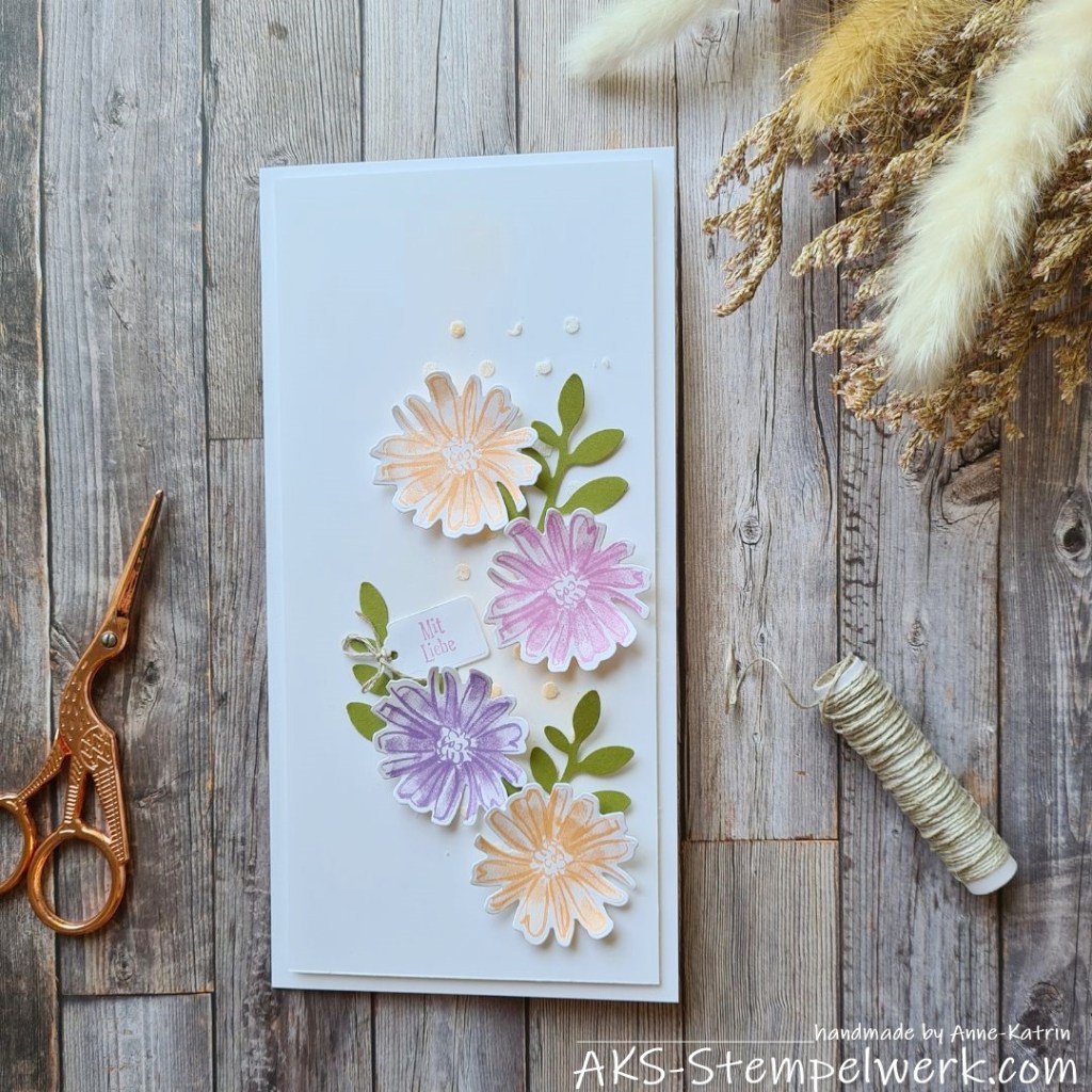 Als Basiskarte und Aufleger habe ich grundweiß gewählt. Das lässt meiner Meinung nach die bunten Blüten noch etwas mehr strahlen.