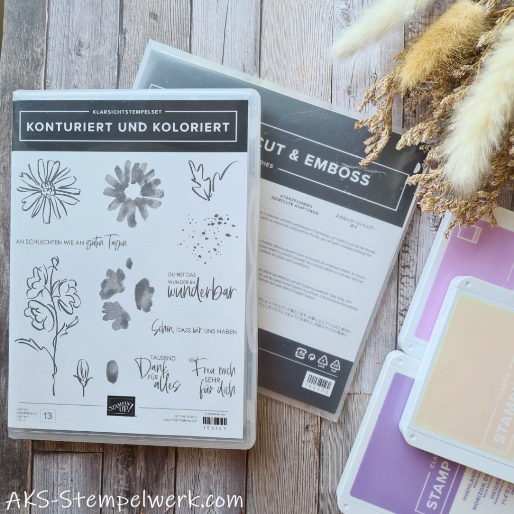 Als Farbkombi habe ich mich für blütenrosa, freesienlila und heidelbeere entschieden und mit dem Stempelset „Konturiert und koloriert“ (Jahreskatalog S. 25) sowie den passenden Stanzformen „gewellte Konturen“ (Jahreskatalog S. 163) die hübschen Blüten hergestellt.