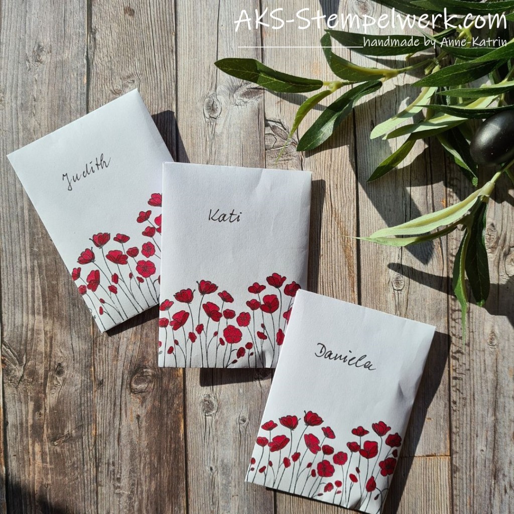 Für die Tüten braucht Ihr einen Bogen Papier in der Größe 8,5 x 20 cm. Auf Instagram gibt’s ein Reel zur Faltanleitung. Bestempelt habe ich diese Tütchen mit dem alten Set „Painted Poppies“ und mit den InColors ausgemalt.