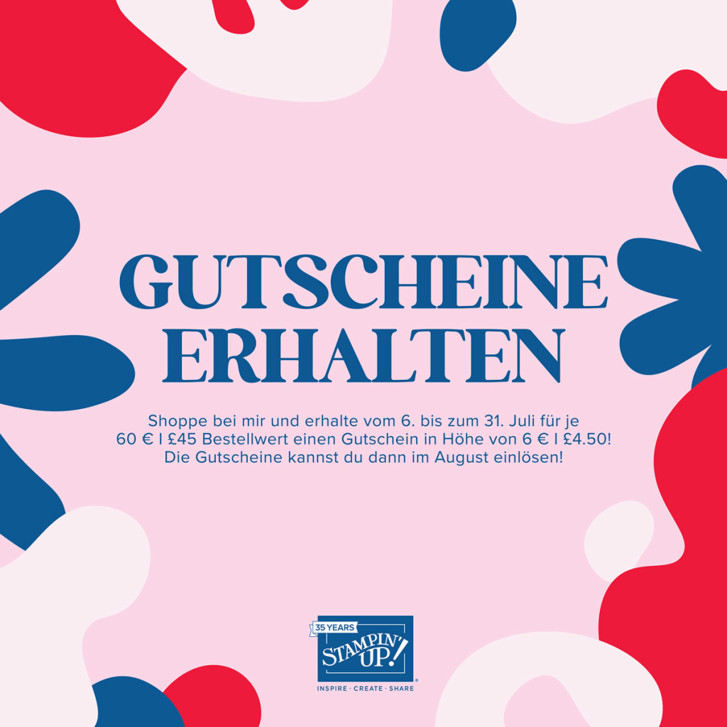 Und zusätzlich gibt es ab dem 6. Juli wieder die Bonustage – Aktion (separter Beitrag folgt), daher schon mal der Hinweis darauf, dass Ihr pro 60 € Bestellwert von Stampin‘ Up! einen Gutschein in Höhe von 6 € bekommt.