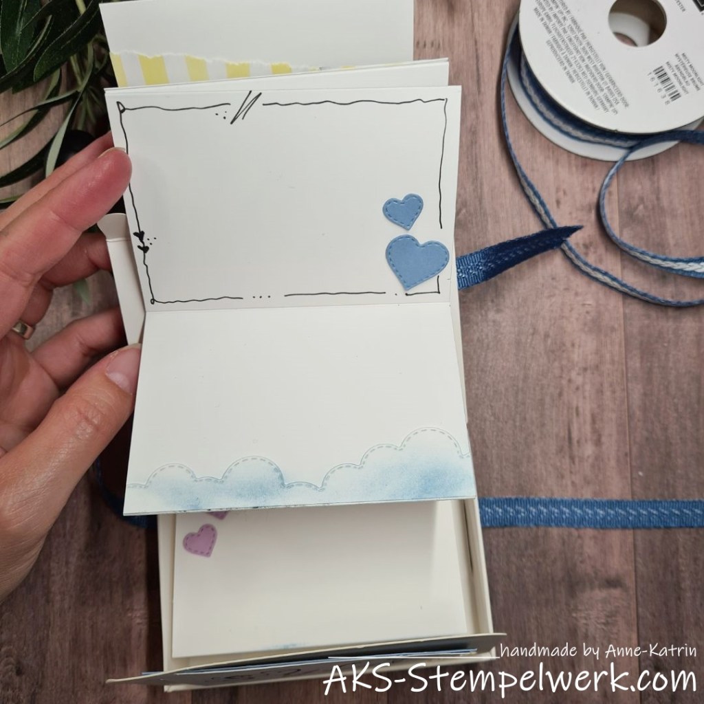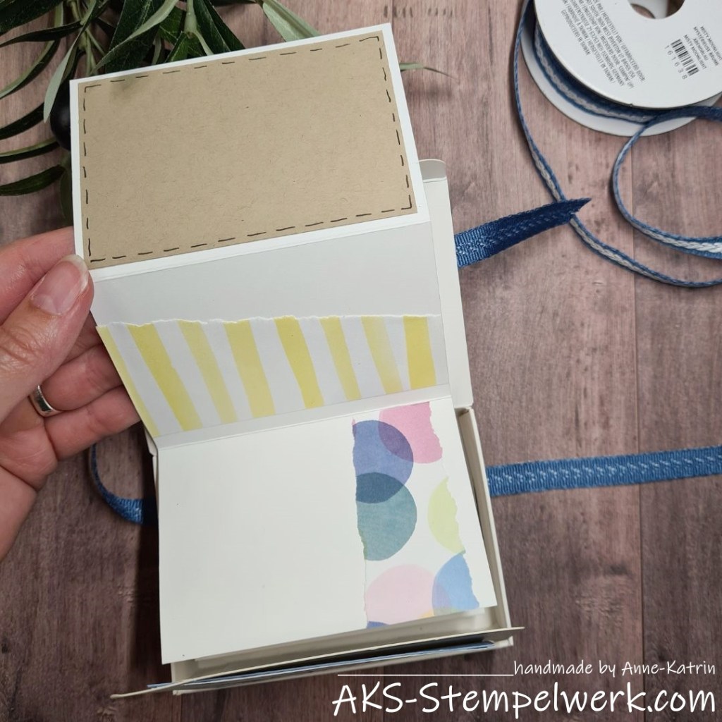 Wenn das Leporello komplett fertig ist, lässt es sich gut unten auf dem Boden der Box einkleben. Man kann es natürlich auch nur lose einlegen.