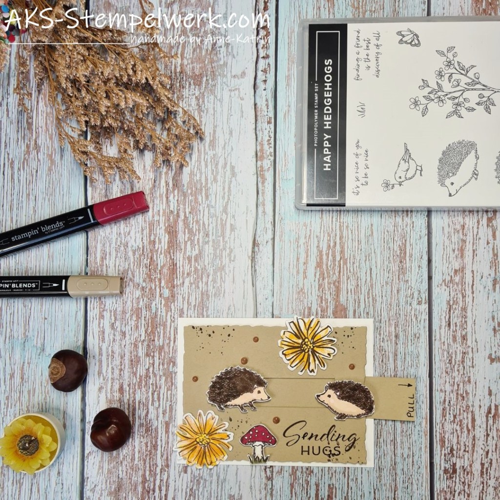 Für die Gestaltung der Karte habe ich die Stempelsets Happy Hedgehogs, Konturiert und koloriert, Layering Leaves und Willkommen verwendet.