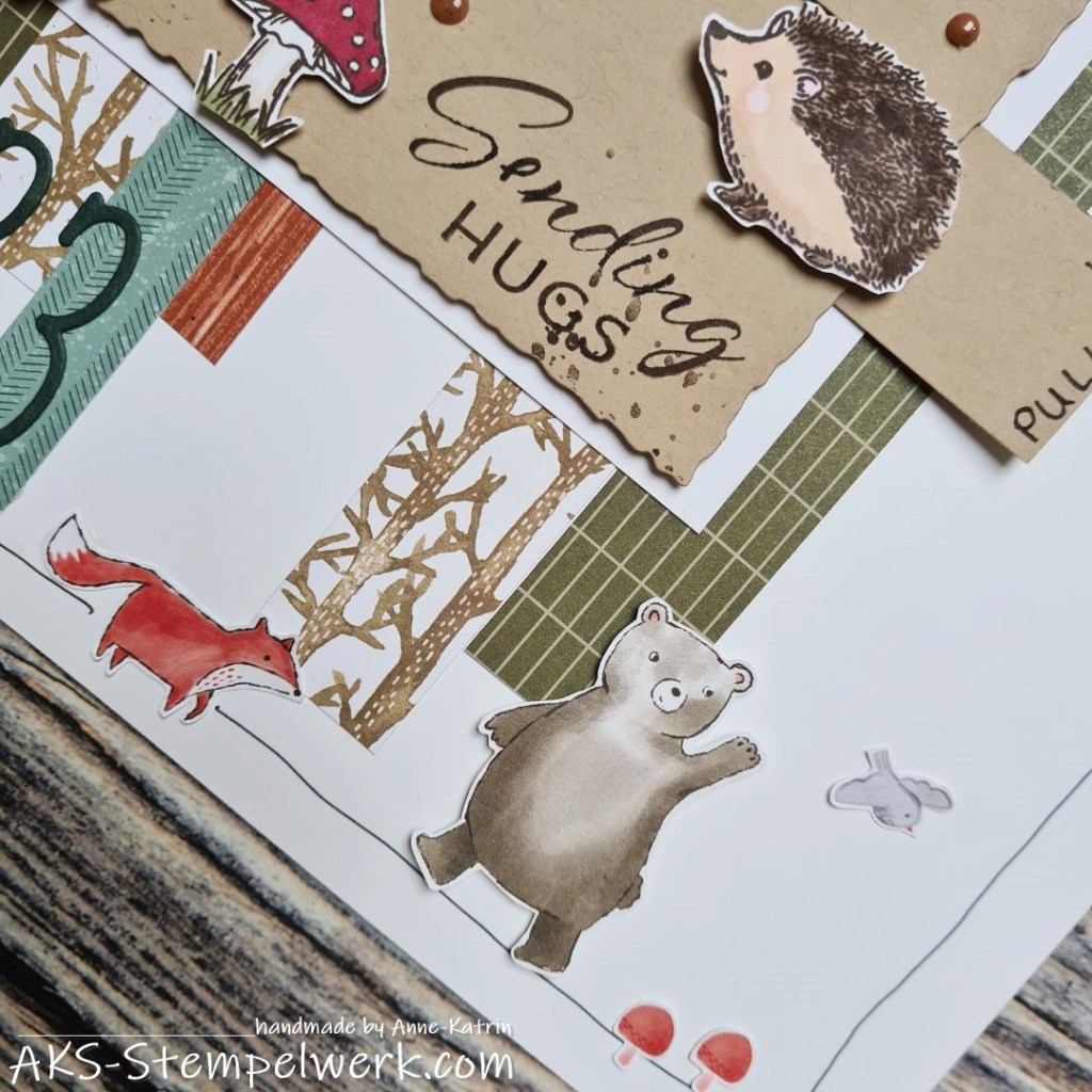Aus dem alten Designerpapier „Fröhlicher Wald“ hatte ich noch ein paar süße Figuren übrig, die auch unbedingt mit aufs Layout wollten…
