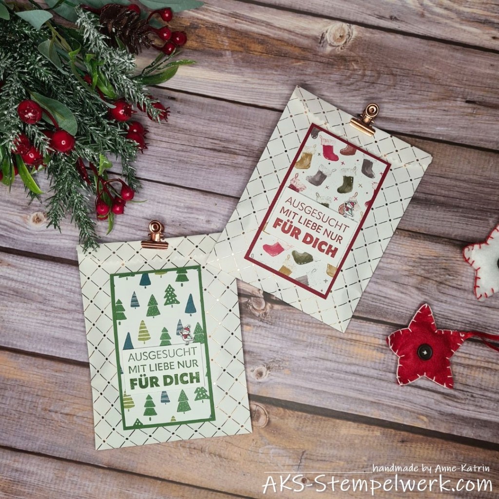 Dafür habe ich die schönen Geschenktüten aus meinem Bestand genommen, weil ich die so wundervoll zu Weihnachten finde. Kombiniert habe ich sie mit gartengrün und chili.