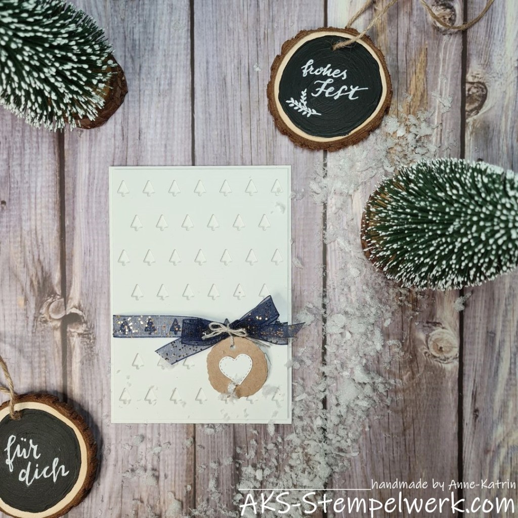 Eine Grußkarte, clean and simple, bestehend aus einer Basiskarte in grundweiß, sowie einem Aufleger ebenfalls in grundweiß, verziert mit dem „Geschenkband mit Glitter in marineblau“ und einem Anhänger aus Kraftkarton.