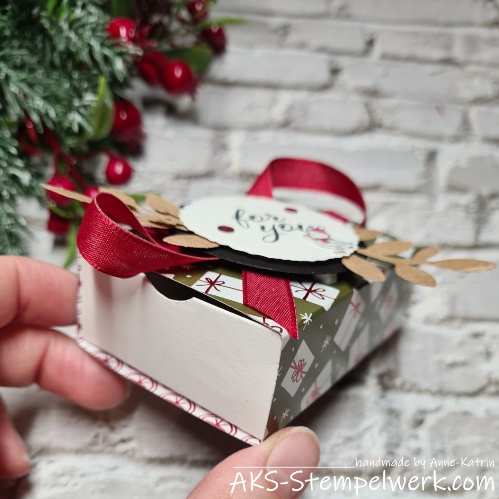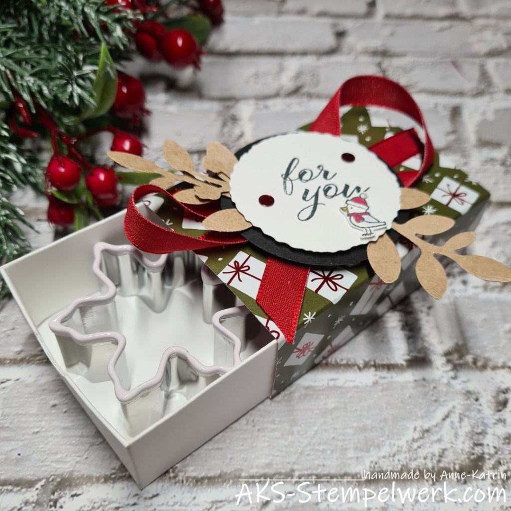 Ich habe hier ein paar schöne Ausstecher verpackt. Dafür habe ich diese kleine Schublade geformt und drumherum mit dem Designerpapier „glänzend weihnachtlich“ verziert.