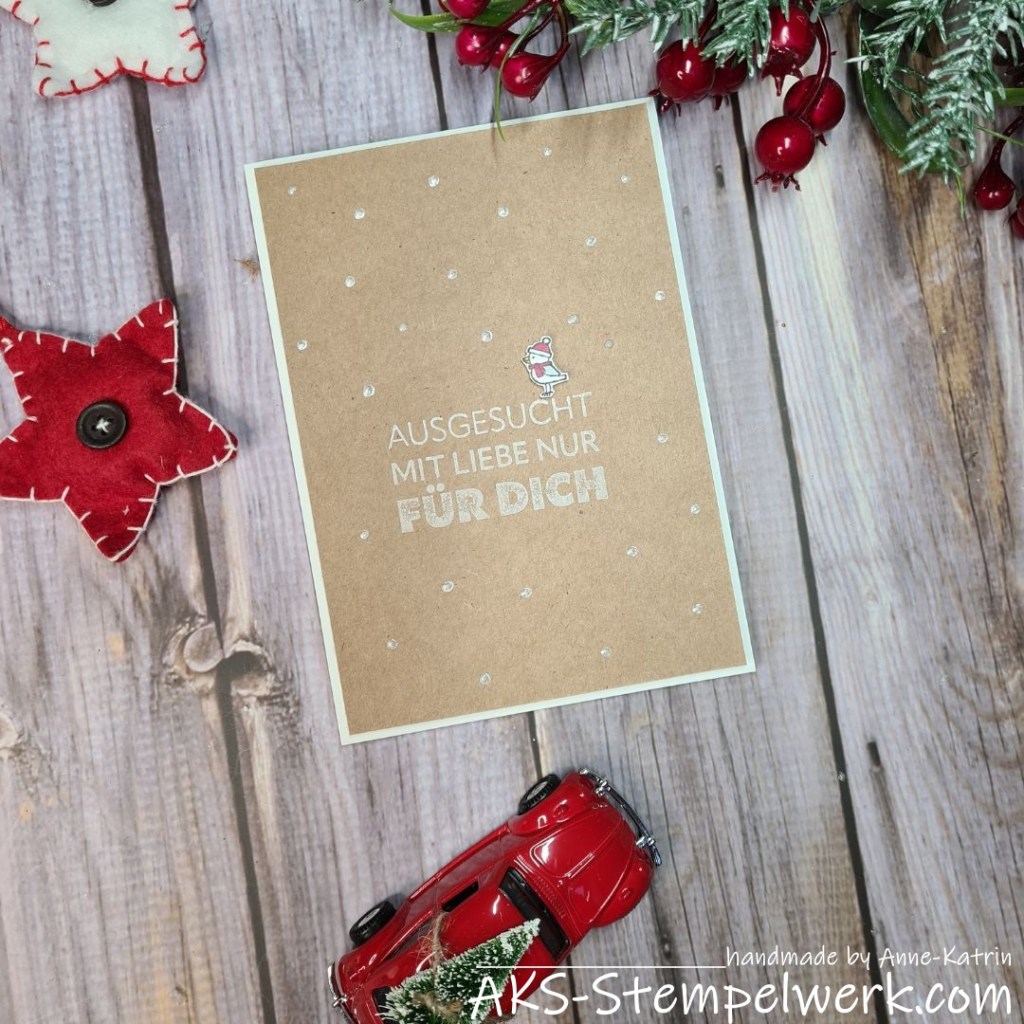 Ihr findet ihn im Stempelset „Heitere Weihnachten“. Er ist mit Stampin‘ Blends coloriert und den Mini-Dimensionals aufgeklebt.