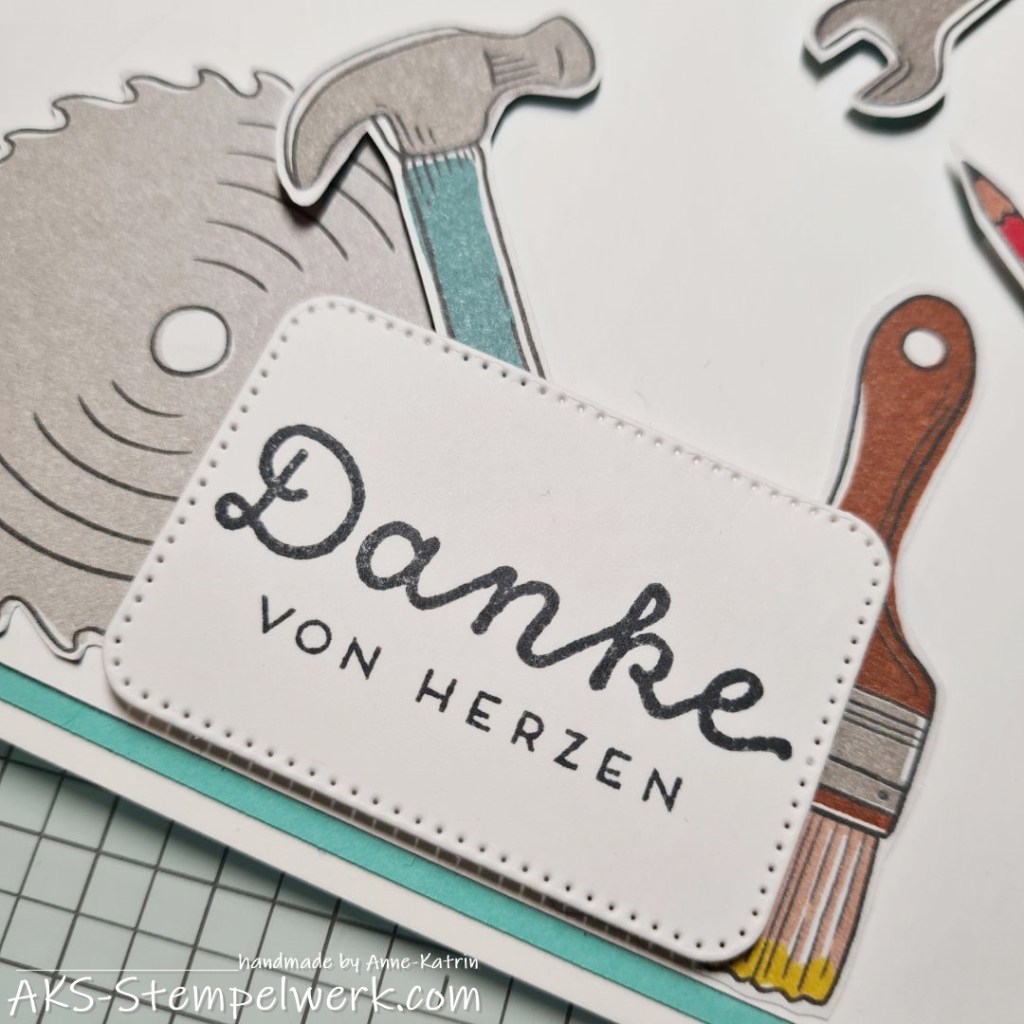 Im Hauptkatalog gibt es übrigens das passende Produktpaket „Wunderbare Werkzeugkiste“, aber ich habe hier eine quadratische Dankekarte gewerkelt, nur mit den ausgeschnittenen Werkzeugen aus dem Papier.