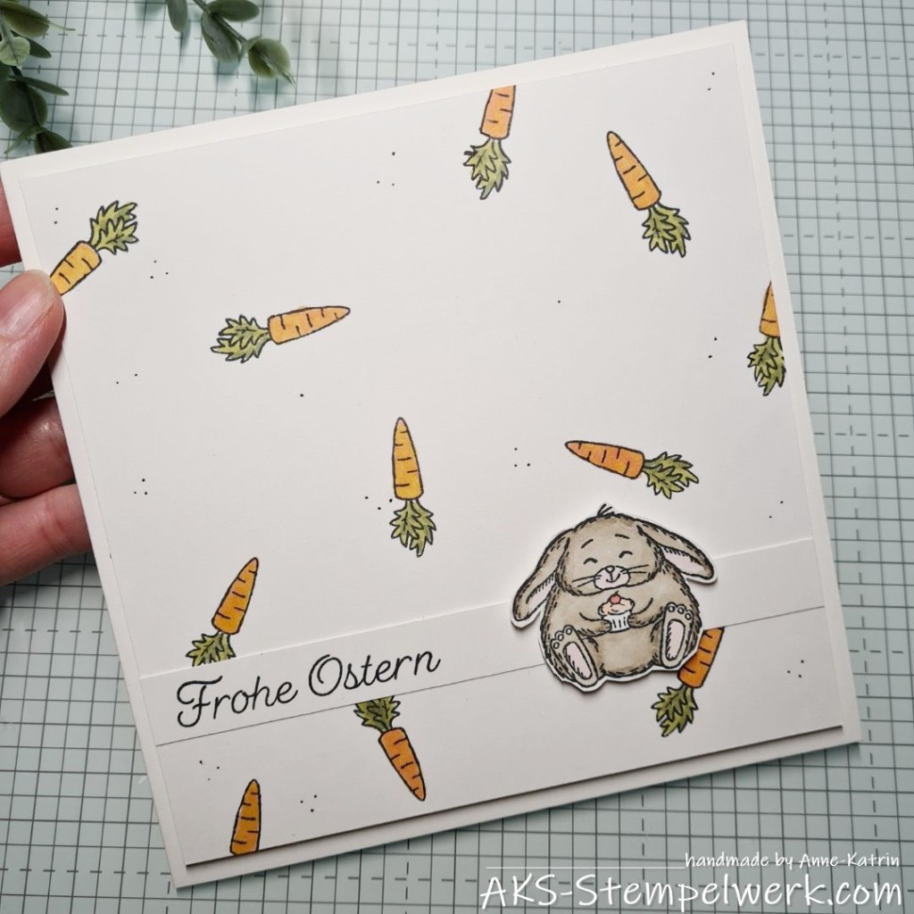 Die Möhre und den Spruch findet Ihr im Set „Osterhase“ und das kleine Kuchen mampfende Häschen mit den Schlappohren stammt aus dem Set „Fluffiest Friends“.