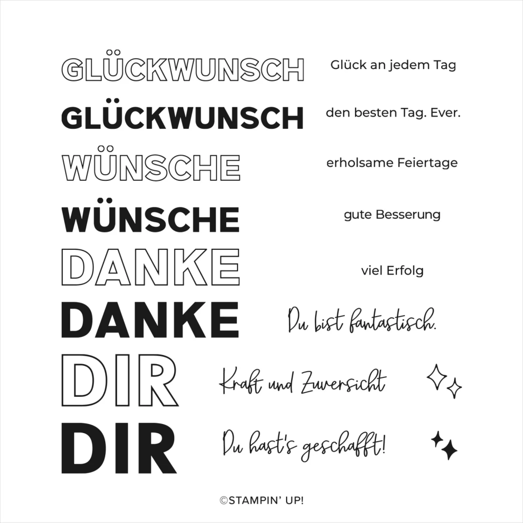 Dazu habe ich mir das neue Stempelset „Schön kombiniert“ geschnappt mit den wundervollen Sprüchen und Wünschen.