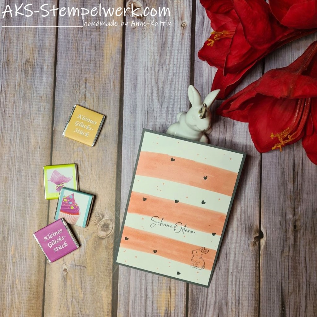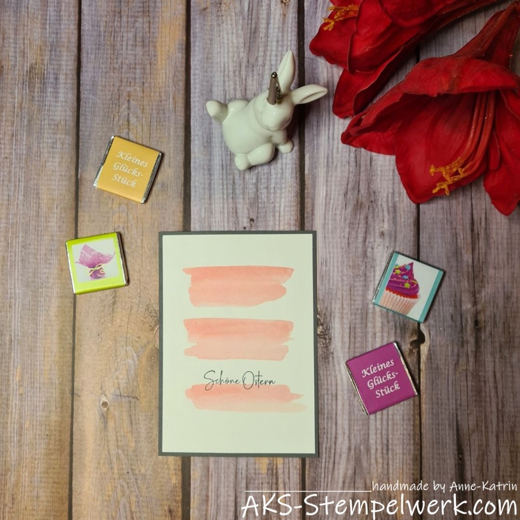 Bei dieser Version habe ich den Hintergrund mit den Wassertankpinseln erstellt und lediglich einen simplen Spruch, wieder aus dem Set „Originelle Ostereier“, aufgestempelt.